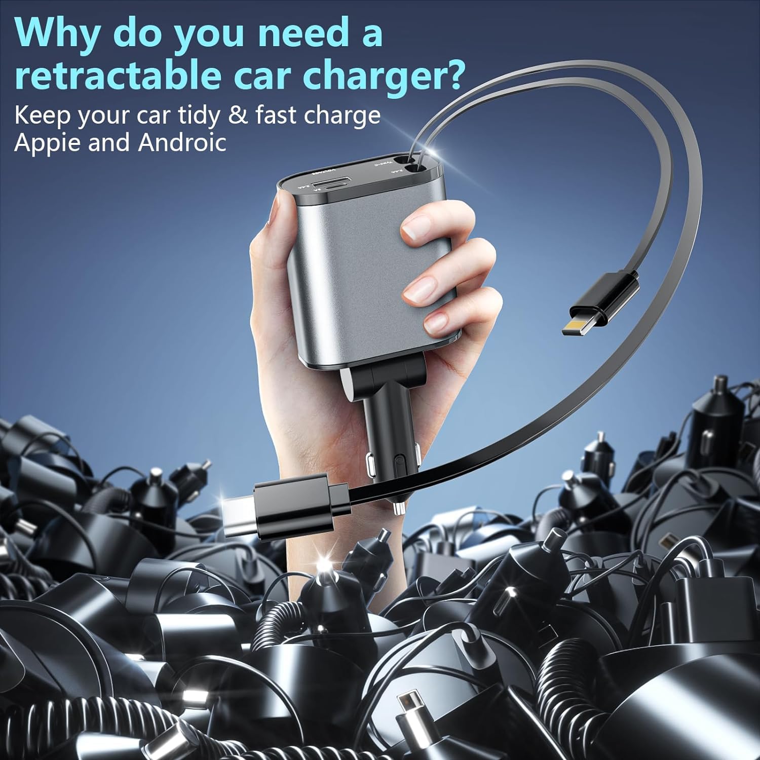 Supports Fast Charging: The Type-C female USB port supports fast charging up to 120W, ideal for quickly powering laptops, tablets, and other high-power devices. Max 120W Output: Charge up to four devices simultaneously with a combined maximum output of 120W for fast and efficient charging. Built-in Dual Cables: Type-C Cable: 5V/3A output, ideal for Android smartphones and other USB-C devices. Lightning Cable: 5V/2.4A output, perfect for Apple devices. Versatile Ports:Type-C Female USB Port: Supports fast charging up to 100W for laptops, tablets, and high-power devices. Type-A Female USB Port: Provides 5V/2.4A output for a wide range of gadgets. Retractable Cables: Built-in Type-C and Lightning cables are retractable for a clutter-free car interior and easy storage.